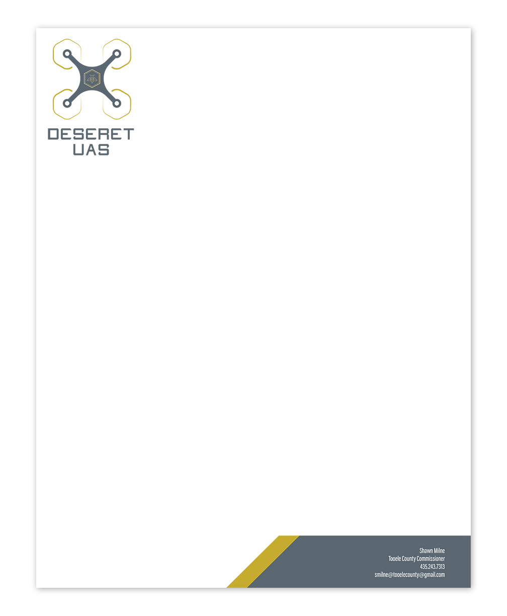 In 2019, worked with Chrysalis Communications to create the first identity prototype for Deseret UAS. Deseret Unmanned Aerial Systems (UAS) is a 501c(6), nonprofit corporation in Utah created jointly by Tooele and Box Elder Counties in close partnership with Ogden City. Our Mission: To facilitate economic development through the advancement of unmanned aerial systems in Utah and to elevate Utah’s presence in UAS industry. Vision Statement: To establish Utah as a global leader in UAS applied research and testing. As the premier organization in Utah dedicated to UAS, we offer a centralized source of information on Utah UAS, promote Utah UAS companies, foster applied research and develop UAS flight test ranges to advance UAS commercial operations Deseret UAS headquarters are located at the Xperience Center in Tooele County. The Xperience Center is a state-of-the-art facility that boasts UAS simulations, viewing real-time test flights, facilities for training, and collaborative meeting spaces.